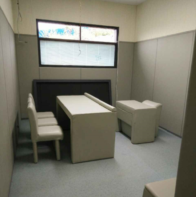 审讯室布局考虑到讯问的严肃性和成像效果,讯问室内的布置和颜色,以及审讯桌椅的色调必须烘托主题,营造审讯的氛围。派出所、检察院等办案区讯问室的墙面有严格要求,墙面材料需要兼具环保、防撞、阻燃特性,与传统的声学材料相比,新型材料更加具备以上的能力,能大大提高审讯安全性。从讯问室的威严性和摄像机拍取视频图像的角度说,讯问室整体装修色调不要太花哨,不易进行过多的摆设。